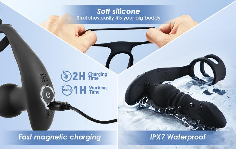 No matter what gender you are, single or attached, this anal toy is perfect for you. Her 1.34" wide drill-shaped glans can enter your asshole easily. Look at her bumpy body curve, pushed her into your body by yourself or partner, you can enjoy the pleasure of the anus being stretched and squeezed; Full elasticity double penis rings can hold any size of dick, ergonomic design fits your body in all directions, no matter what sex position you want, she will firmly cling your body and hard to fall off. Get the remote, she will obey you like a slave, 7 thrusting & 7 vibrating for your choice! Whether you are playing alone or with others, she can hit your sexy point from gentle to wild according to your command taking you to experience more fun play. Anal vibrator, prostate massager and cock ring designed to be 3 in 1 take you to experience a variety of adventures. Get her and start a new sex journey.