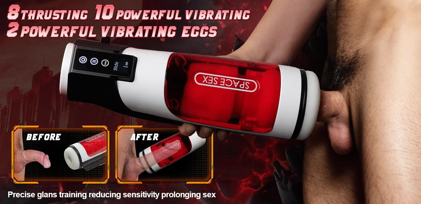 - 8 thrusting 10 vibrating precise glans training reducing sensitivity and providing lifelike sex fun.
