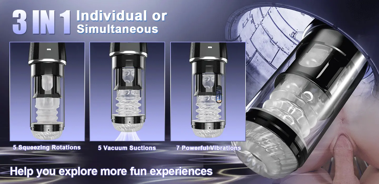 Multi-Dimensional Pleasure: Dive into a sea of ecstasy with 5 rotating, 5 sucking, and 7 vibrating modes. Whether you crave a singular sensation or a symphony of stimulation, this masturbation cup adapts to your desires, offering a spectrum of pleasure experiences. Dual-Purpose Design: Elevate your solo play and training sessions with powerful suction capabilities. This 2-in-1 marvel not only delivers intense pleasure but also aids in enhancing endurance, blending enjoyment with performance improvement. Triple Motor Power: Equipped with an N20 vibration motor, a 370 air pump, and a dedicated rotation motor, our device guarantees stability and strength in function. Experience the relentless power and precision that takes your pleasure to new peaks. Luxurious Silicone Sleeve: Immerse yourself in the indulgence of a silicone inner sleeve featuring a 0.98-inch thick entrance and 3-tiered texture for a massage that feels as real as it gets. The soft, comfortable embrace of our device offers an authentic experience designed to satisfy. Visual Excitement: Catering to your voyeuristic desires, the transparent cup allows you to witness the action. With three easy-to-use buttons, control is at your fingertips, making it effortless to navigate through modes and find your perfect setting.